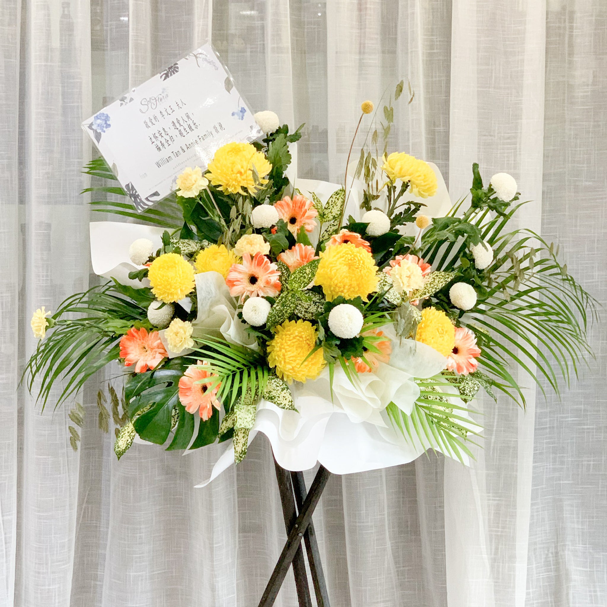 Fresh bloom condolence stand.