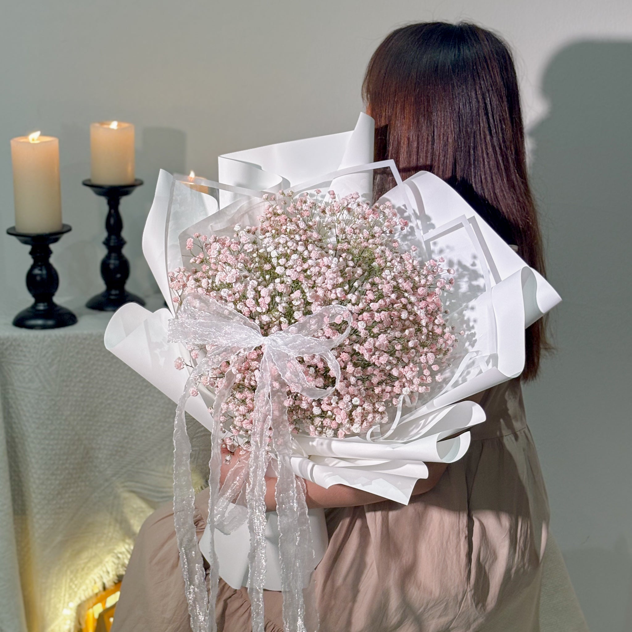 This is a dyed baby breath bouquet that wrapped with a delicate lace ribbon, creating a soft and dreamy Valentine’s look.