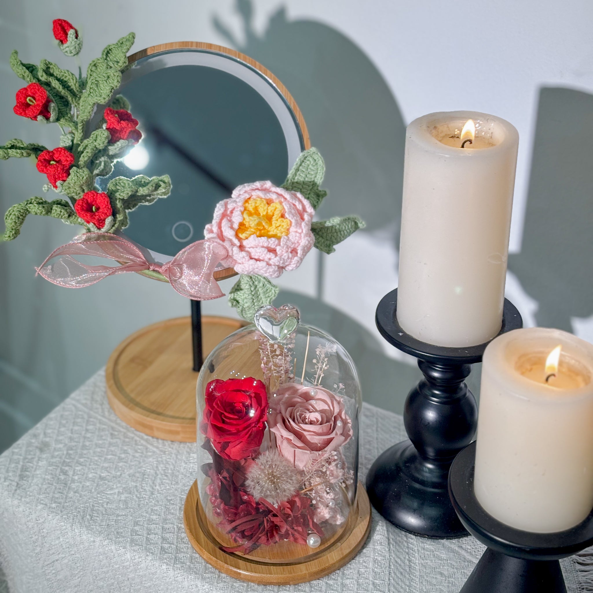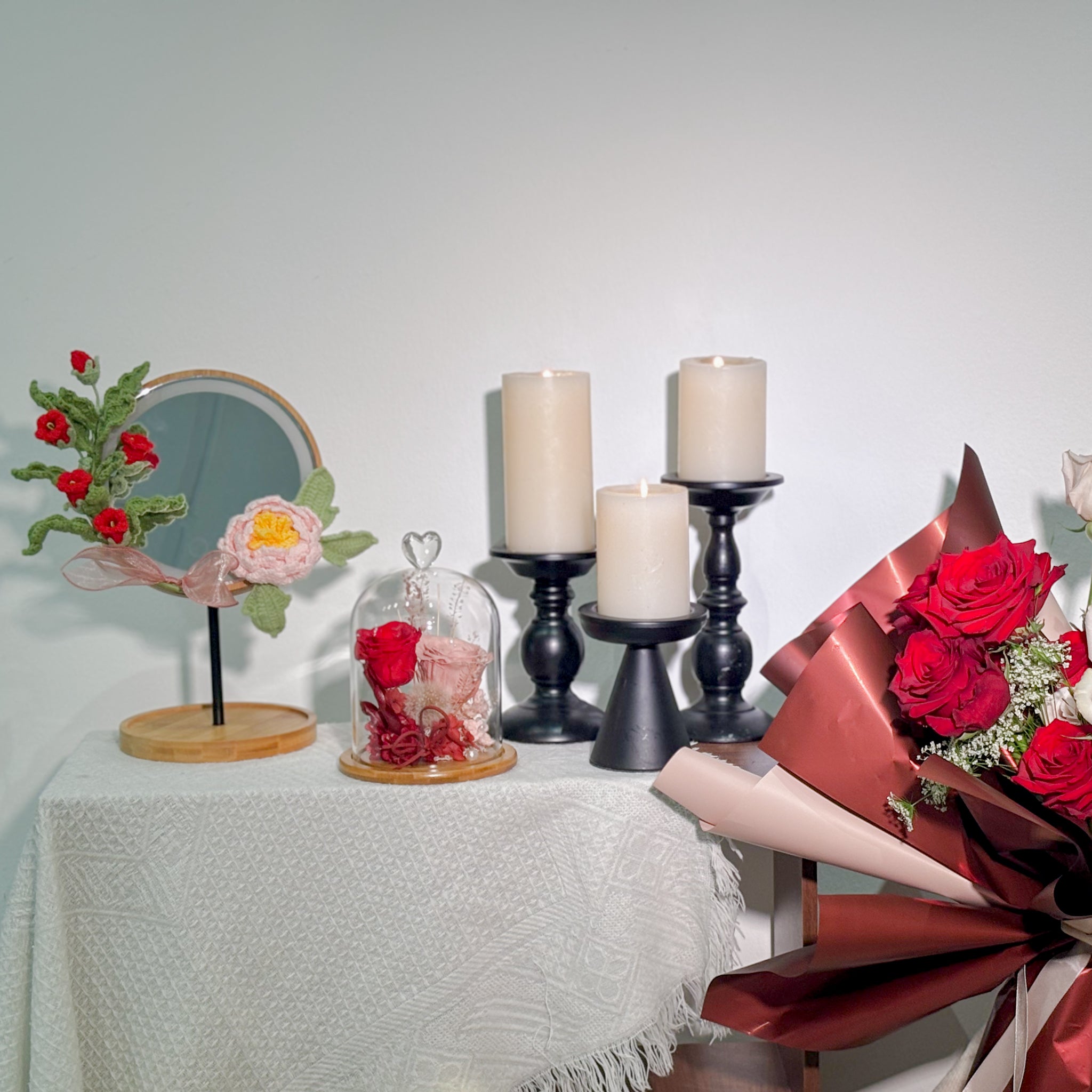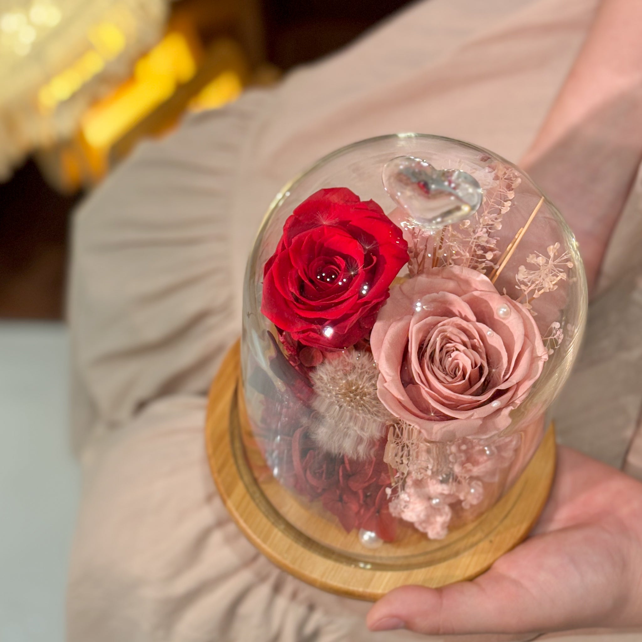 This bold three piece Valentine's bundle features a fresh bouquet crafted in two tones with premium red roses and  premium quicksand roses - paired with a LED Mirror and a delicate bell jar display. Powerful yet refined, it is made for someone who loves certainty and stands beautifully on their own.